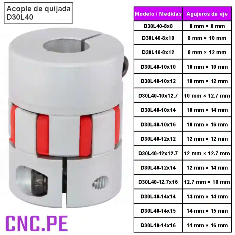 El acople de quijada D30L40 combina diseño robusto, flexibilidad y precisión, ofreciendo una solución eficaz para el acoplamiento entre motor y tornillo en sistemas CNC o automatizados.