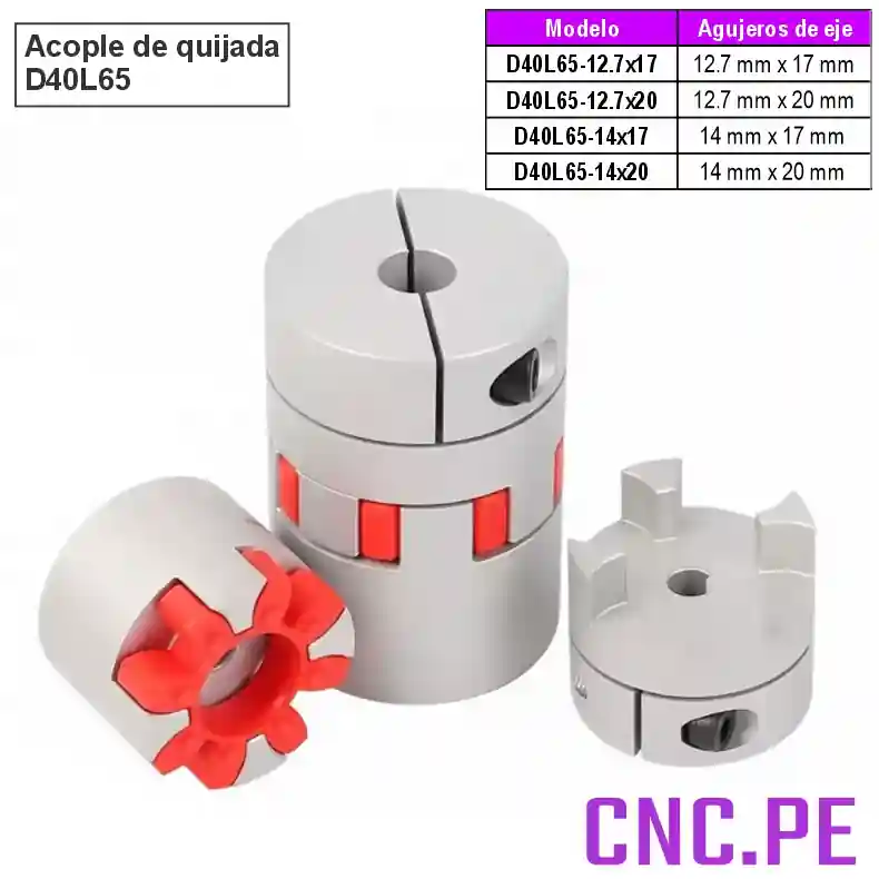 Acople D40L65 12.7x17mm con orificios de 12.7mm y 17mm. ,Acople D40L65 12.7x20mm con orificios de 12.7mm y 20mm. ,Acople D40L65 14x17mm con orificios de 14mm y 17mm. ,Acople D40L65 14x20mm con orificios de 14mm y 20mm. |