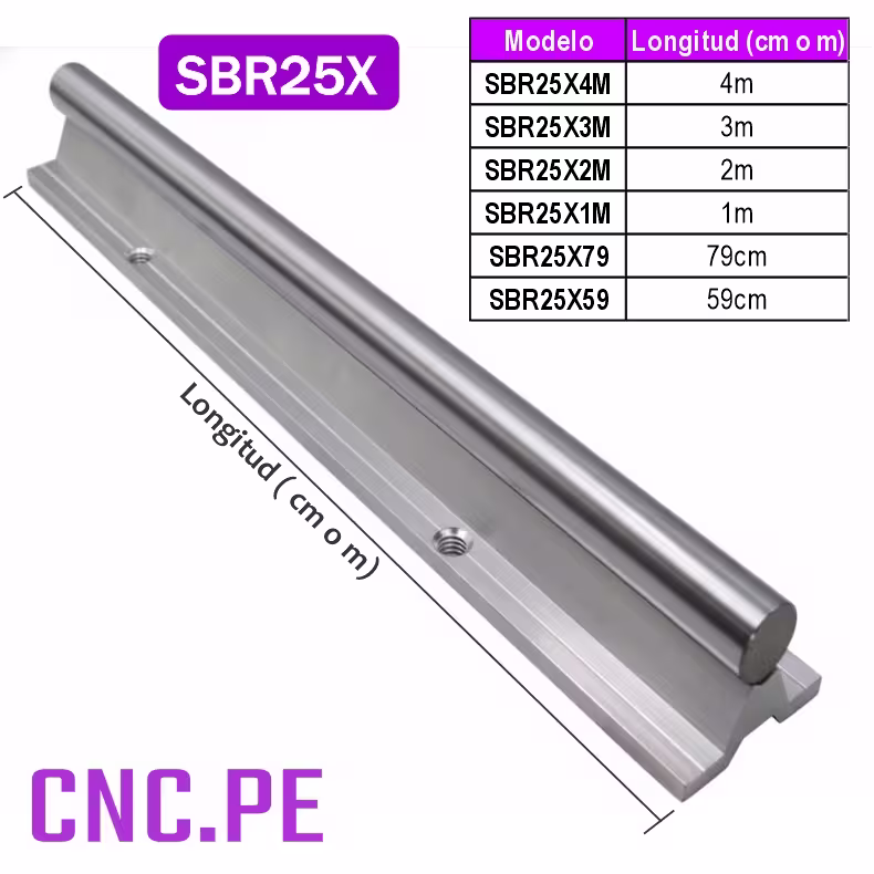 | 3️⃣ Guía lineal SBR25 de eje cromado de 2 metros | 2000 mm | Ø 25 mm | Aluminio mecanizado | 4 pernos | CNC Router mediano |