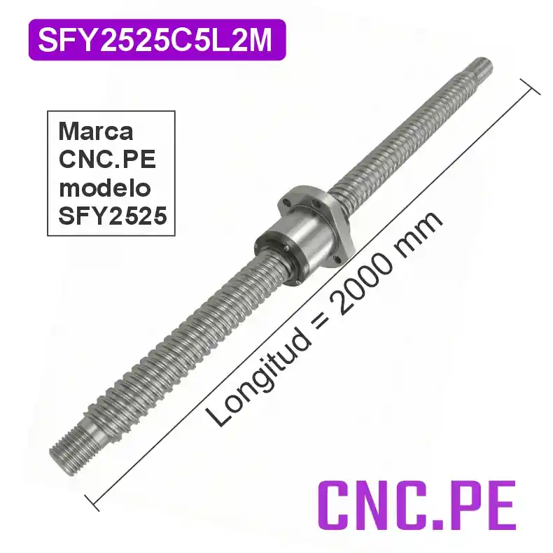 Husillo de bolas SFY2525 C5 de 2000mm marca CNC.PE. Tornillo de bolas Ø25mm, paso 25mm, alta velocidad, precisión industrial y máxima eficiencia para CNC y automatización.