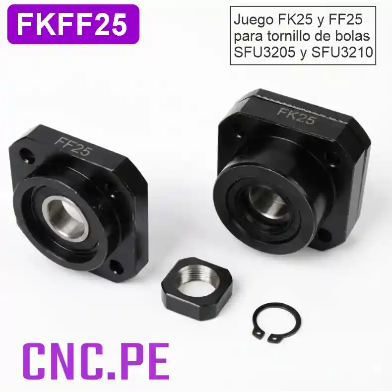 Juego de rodamientos de pie FK25 y FF25 para tornillo de bolas SFU3205 y SFU3210. Alta precisión, rigidez y estabilidad para CNC.