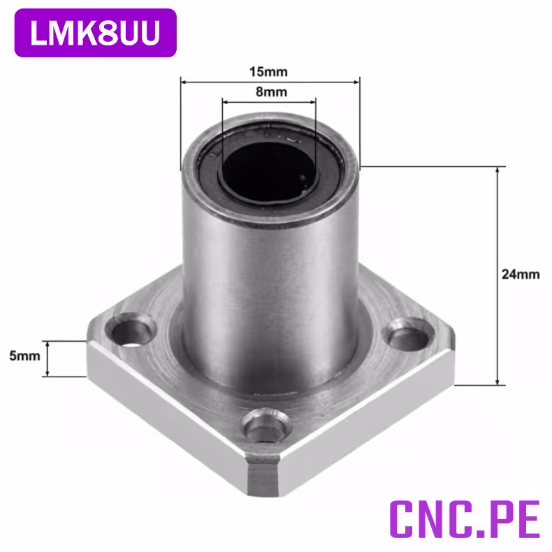 El rodamiento lineal LMK8UU es un cojinete de movimiento lineal diseñado para barras redondas de 8 mm de diámetro. Gracias a su brida cuadrada tipo “K”, ofrece un montaje firme, estable y compatible con diversas máquinas de precisión. Además, su diseño de bolas recirculantes proporciona un desplazamiento suave, exacto y con una fricción mínima, lo que lo convierte en una excelente opción para sistemas CNC y equipos de automatización ligera.