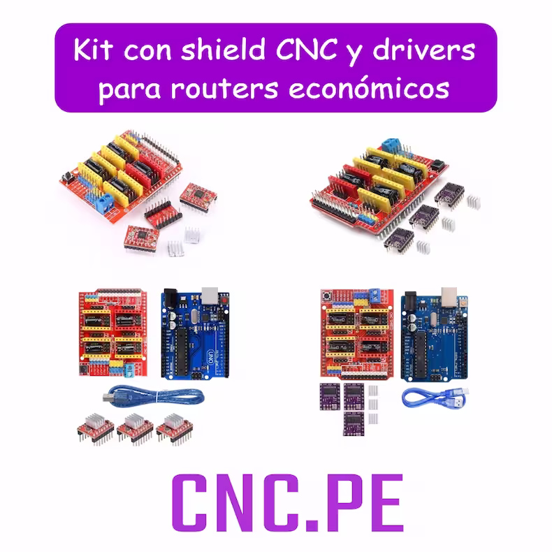 Kit CNC económico con Arduino UNO, shield CNC y drivers A4988 o DRV8825. Ideal para proyectos DIY o routers CNC de escritorio. Compatible con GRBL.