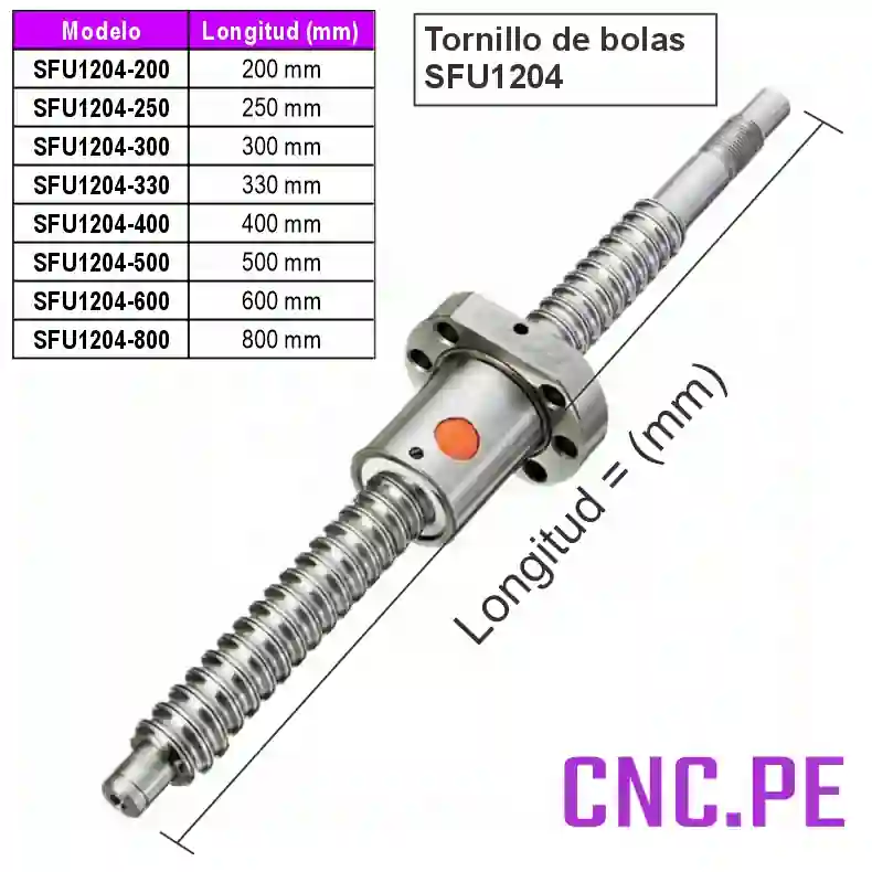 SFU1204-200mm con recorrido de 90mm. ,SFU1204-250mm con recorrido de 140mm. ,SFU1204-300mm con recorrido de 190mm. ,SFU1204-330mm con recorrido de 220mm. ,SFU1204-400mm con recorrido de 290mm. ,SFU1204-500mm con recorrido de 390mm. ,SFU1204-600mm con recorrido de 490mm. ,SFU1204-800mm con recorrido de 690mm. |